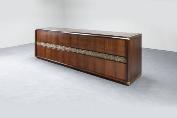 Credenza in legno a sei ante fronte con inserto in ottone brunito. Anni '70 cm [..]