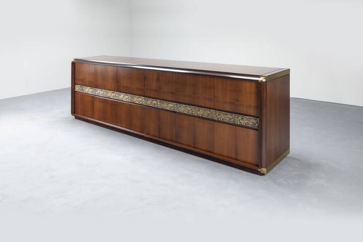 Credenza in legno a sei ante fronte con inserto in ottone brunito. Anni '70 cm 90x272x56