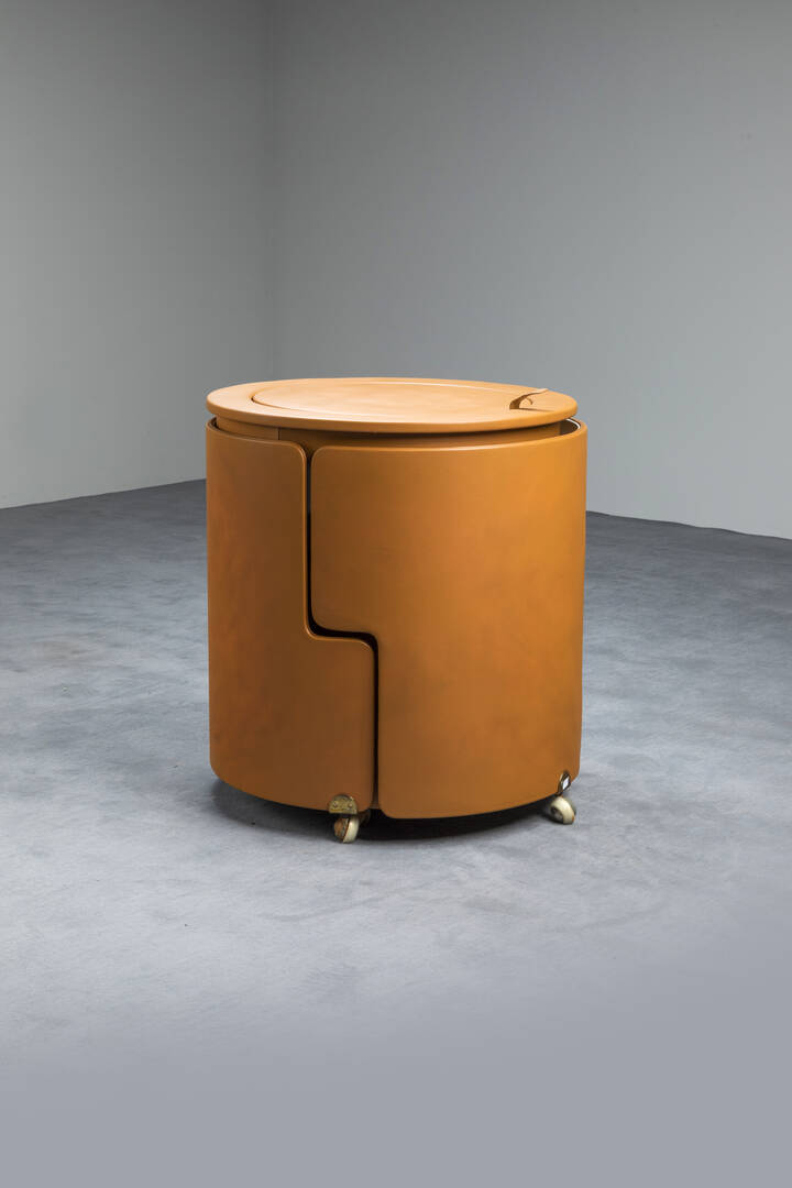 Poltroncina-toeletta in compensato curvato rivestito in similpelle. Prod. Poltrona Frau 1968. cm 74x65 Bibl.: Giuliana Gramigna Repertorio 1950-1980 Mondadori 1985 pag. 270.