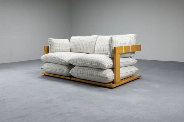 Divano con struttura in legno cuscini imbottiti rivestiti in tessuto. Prod. UVET [..]