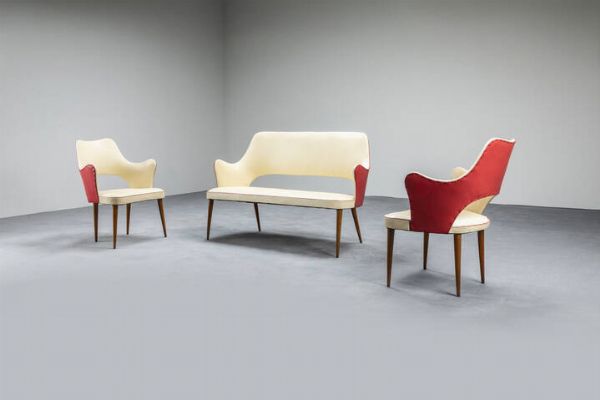 Divano e due poltrone con imbottitura rivestita in skai gambe in legno. Anni '50 [..]