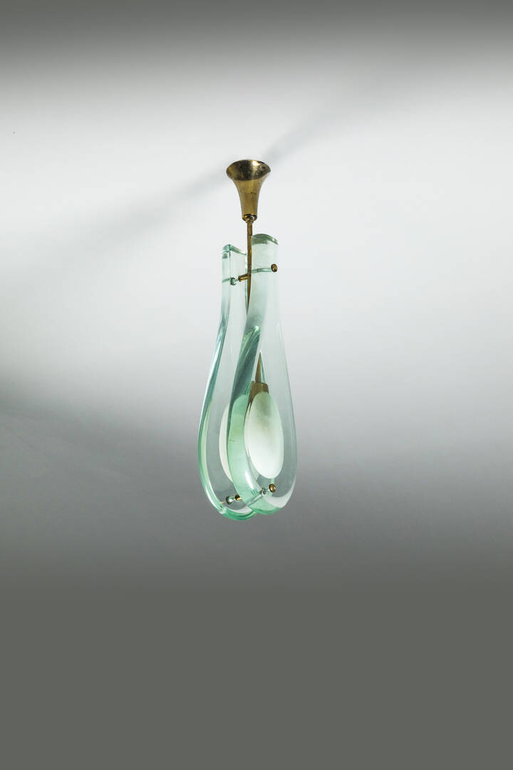 Lampada a sospensione con struttura in ottone diffusori in vetro di forte spessore. Prod. Fontana Arte anni '60 h cm 53