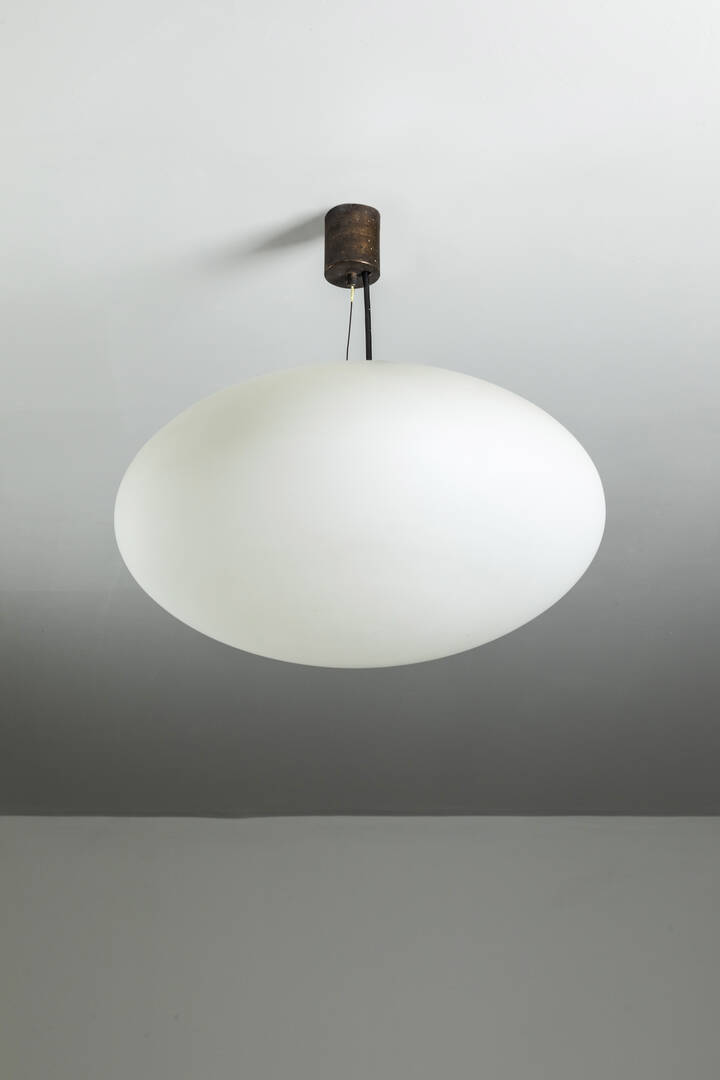 Lampada a sospensione in ottone e vetro opalino. Anni '50 dian cm 45