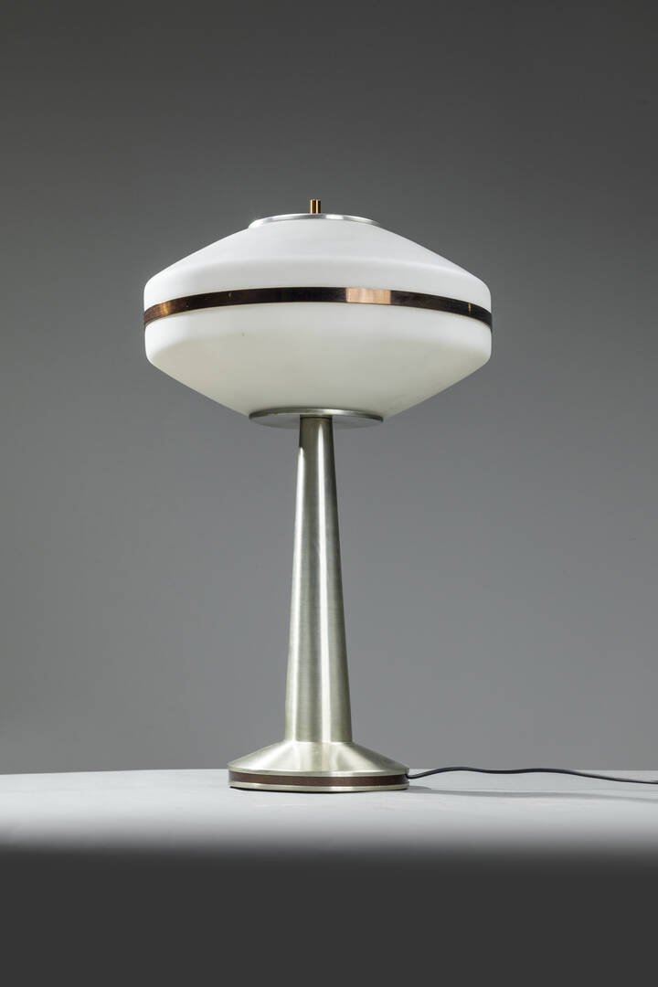 Lampada da tavolo in acciaio con diffusore in vetro. Anni '60 h cm 65