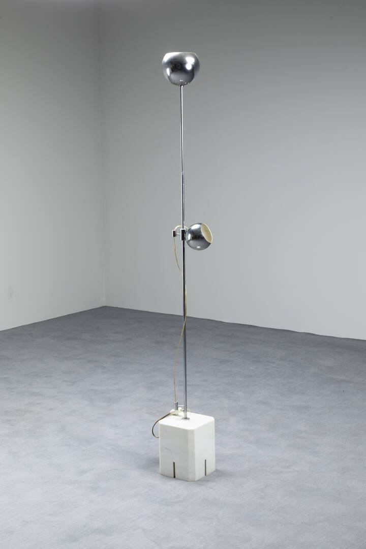 Lampada da terra in acciaio cromato base in marmo bianco. Anni '70 h cm 185