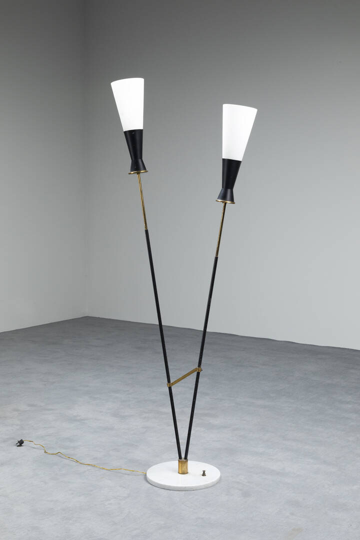 Lampada da terra in ottone e metallo verniciato diffusori in vetro satinato base in marmo. Anni '50 h cm 158