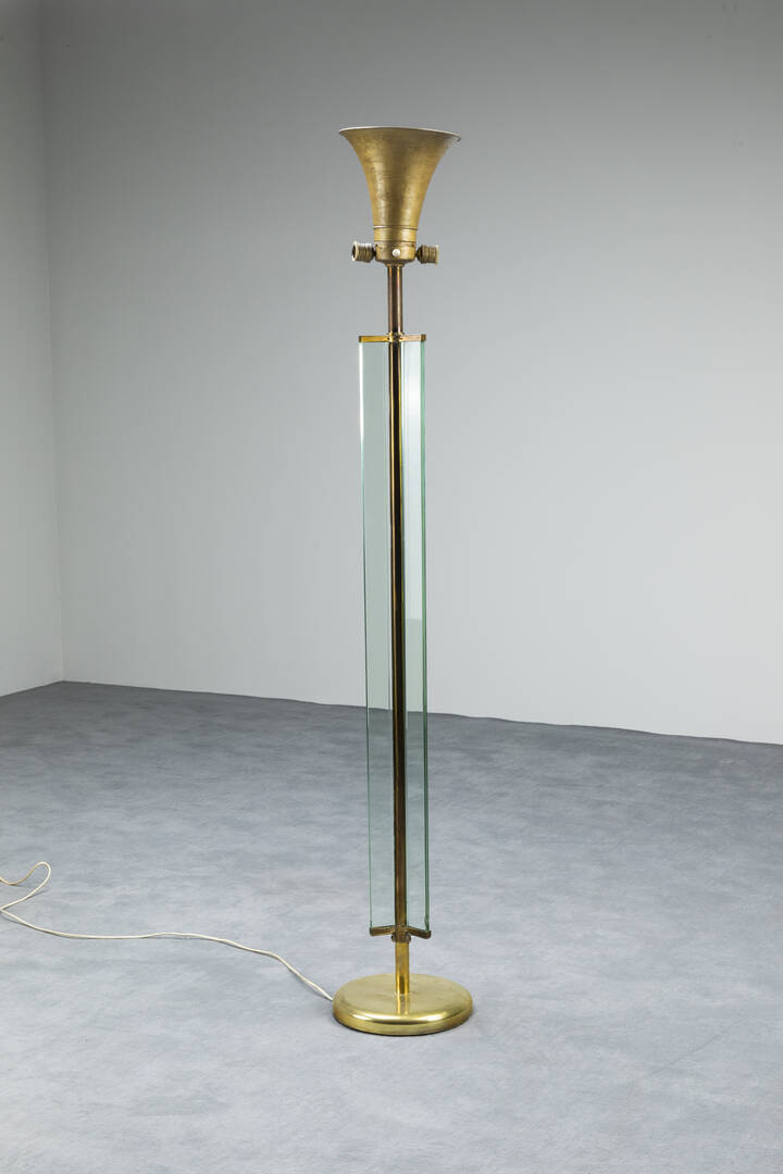 Lampada da terra in ottone fusto rivestito da piastre in vetro colorato. Anni '50 [..]