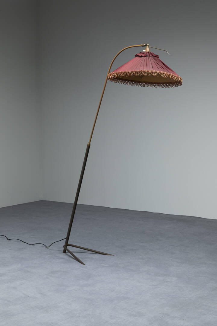 Lampada da terra in ottone paralume in tessuto. Anni '50 h cm 174