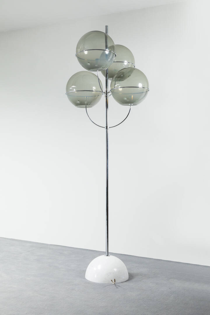 Lampada da terra con telaio cromato lucido e quattro bracci con diffusori in vetro soffiato a mano Vistosi. Base in marmo bianco emisferica. Prod. Knoll anni '70 h cm 258