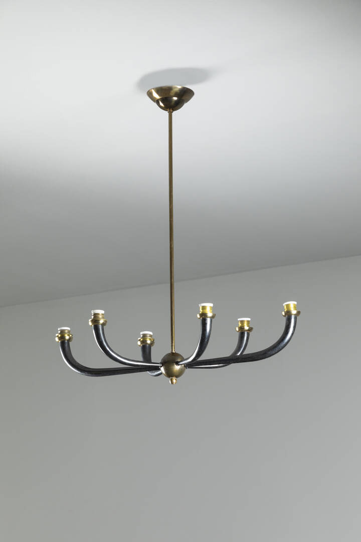 Lampadario in ottone e metallo verniciato. Anni '50 h cm 103