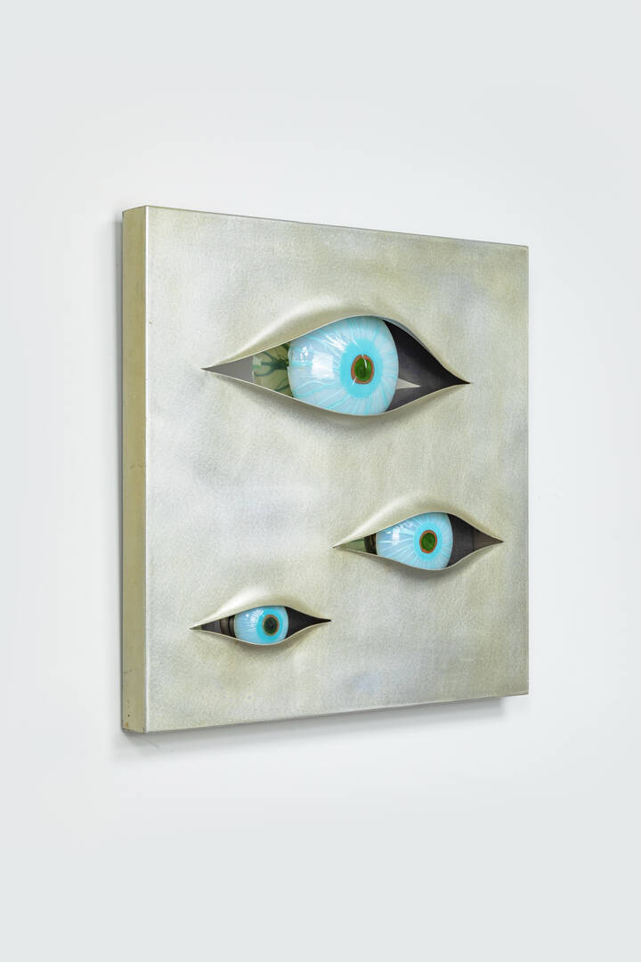 Pannello in acciaio inox alluminio e vetro di Murano Firmato in basso a destra Prod. Esperia 1974 cm 80x80