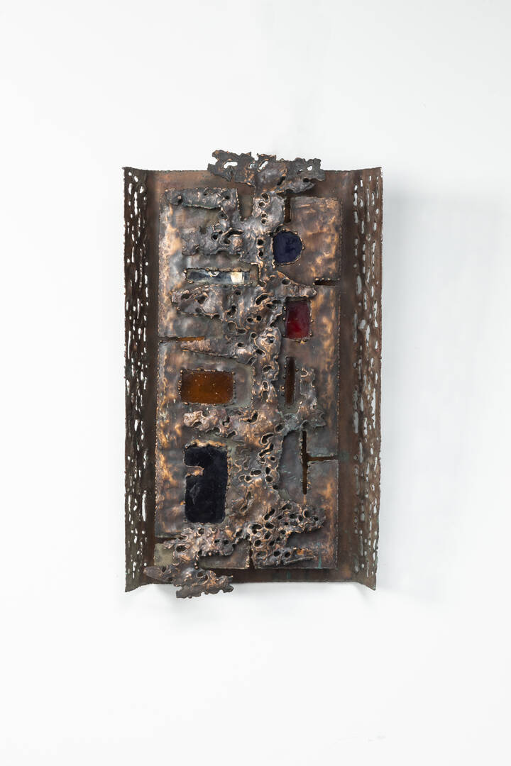 Plafoniera / applique in rame lavorato con inserti in vetro colorato. Anni '70 cm 70x42