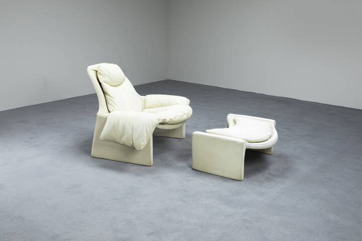Poltrona e poggiapiedi con struttura in legno e imbottitura rivestita in pelle. Prod. Saporiti Proposal anni '70 Poltrone cm 82x90x93 poggiapiedi cm 33x74x54 Bibl.: Giuliana Gramigna Repertorio del Design Italiano1950-2000 Allemandi 2011 pag. 176