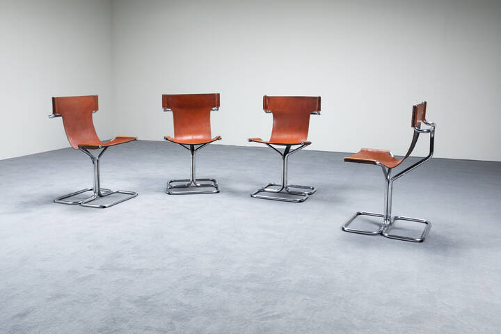 Quattro sedie in metallo cromato sedute in cuoio. Prod. Acerbis anni '70 cm 84x52 5x50