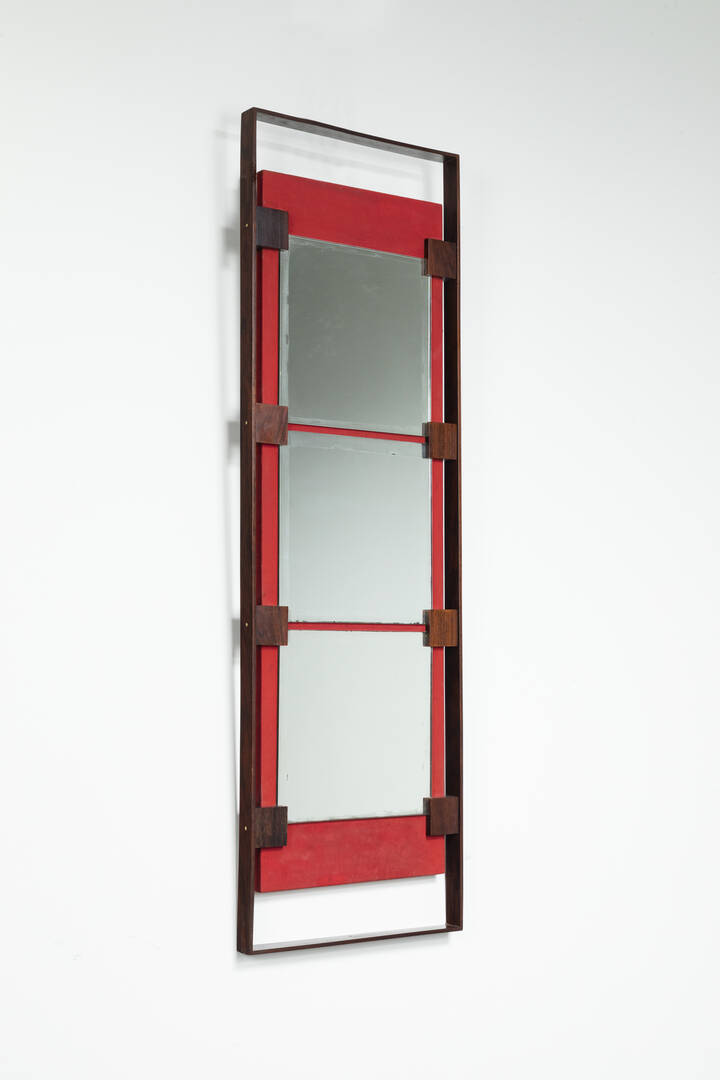 Specchiera composta da tre specchi su supporto in legno. Anni '50 cm 131x41