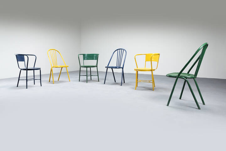 Tre sedie e tre poltroncine in metallo verniciato. Anni '50 poltroncine cm 73x53x60 [..]