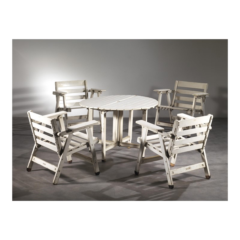Carlo Hauner (Brescia, 1927 - Salina, 1996) SET DA GIARDINO DELLA SERIE CALIFORNIA composto da quattro poltroncine ed un tavolo pieghevole in legno laccato bianco Adesivo del produttore sul tavolo Produzione Fratelli Reguitti, Italia, 1970 tavolo alt. cm 70 diam. cm 101,5 poltroncine cm H73xL75x71