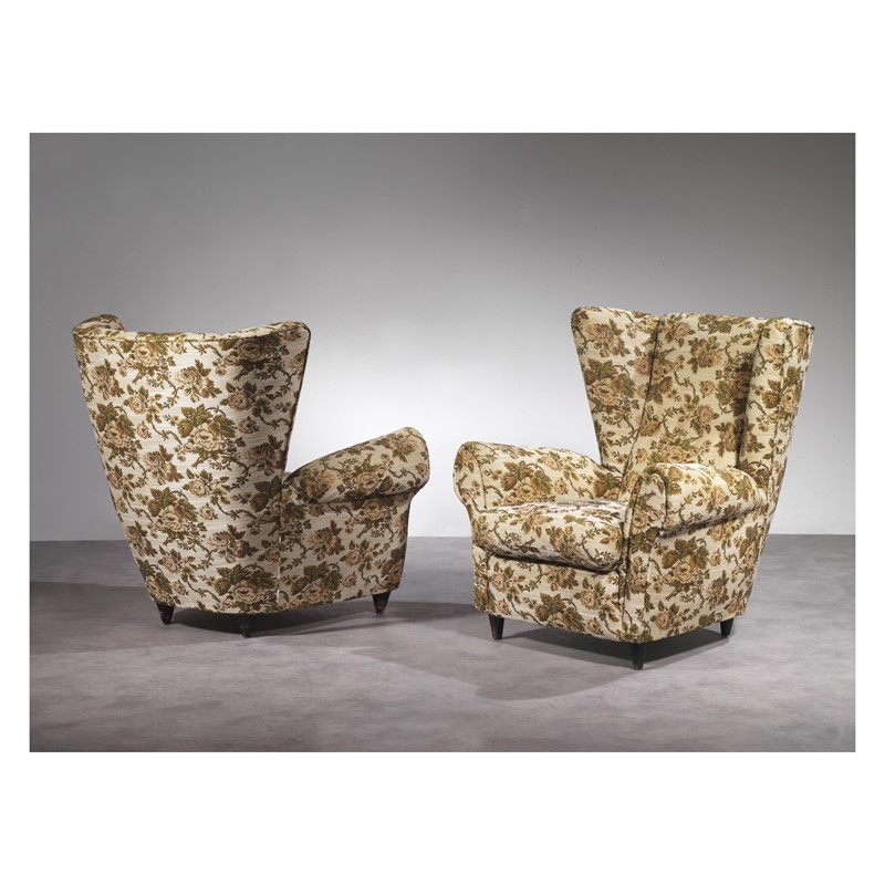 A PAIR OF ARMCHAIRS, WOODEN STRUCTURE, FLOWERS FABRIC UPHOLSTERY