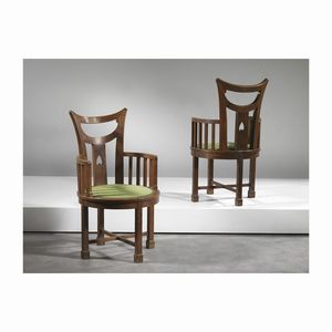 Nello stile di Norman Shaw COPPIA DI POLTRONE ARTS AND CRAFTS in legno con seduta imbottita e rivestita in stoffa [..]