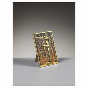 Mosera PLACCA CON STATIVO in ottone e smalto, raffigurante la danza del fuoco Produzione Spagna, 1950 circa cm [..]