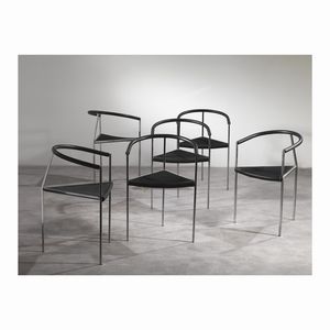 Maurizio Peregalli (Varese, 1951) SEI SEDIE MODELLO SAVONAROLA struttura in metallo cromato, dettagli in gomma [..]