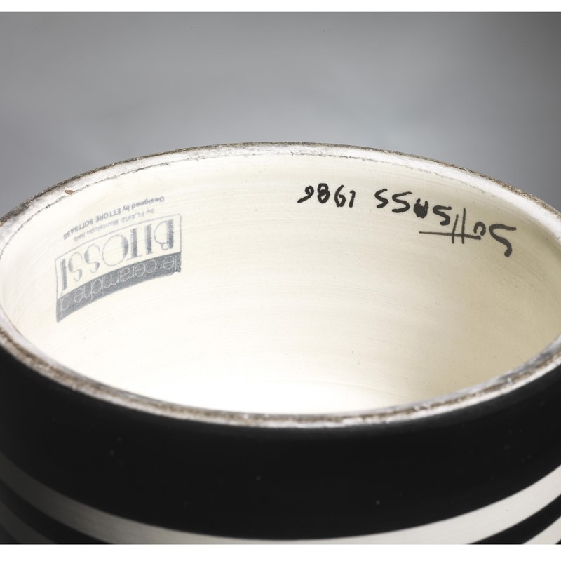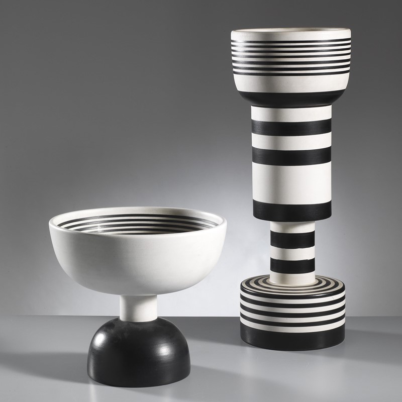 Ettore Sottsass (Innsbruck, 1917 - Milano, 2007) ALZATA GRANDE E VASO ROCCHETTO DELLA SERIE SOTTSASS 1986 in ceramica nei toni del bianco e del nero Firma dell’autore e del produttore sul fondo Produzione Bitossi, Italia, 1991 alt. cm 22 e cm 48