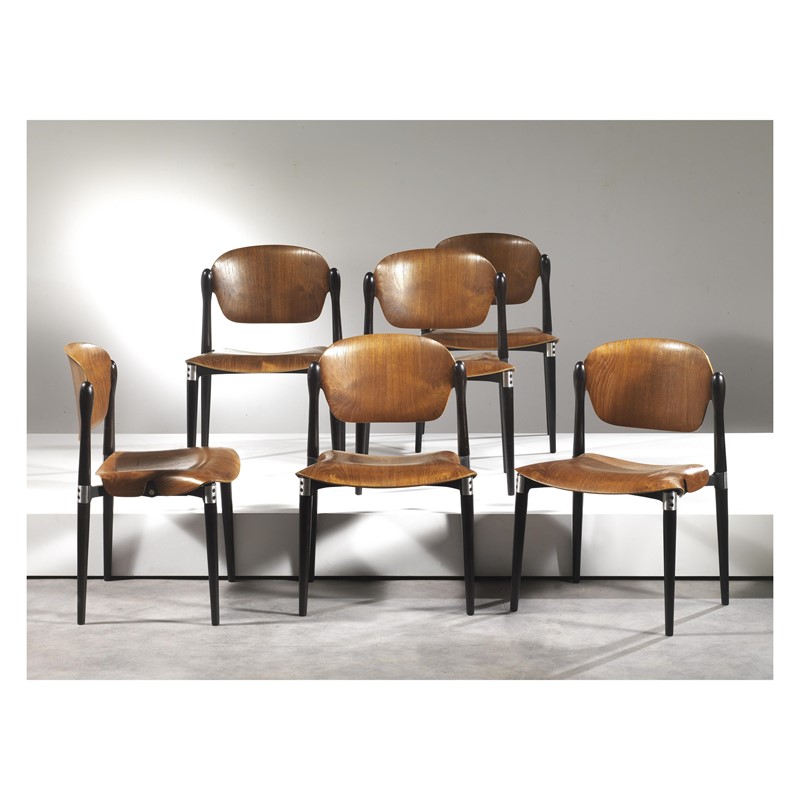 SIX «S83» CHAIRS, CURVED WOOD STRUCTURE, CHROMED METAL INSERTS