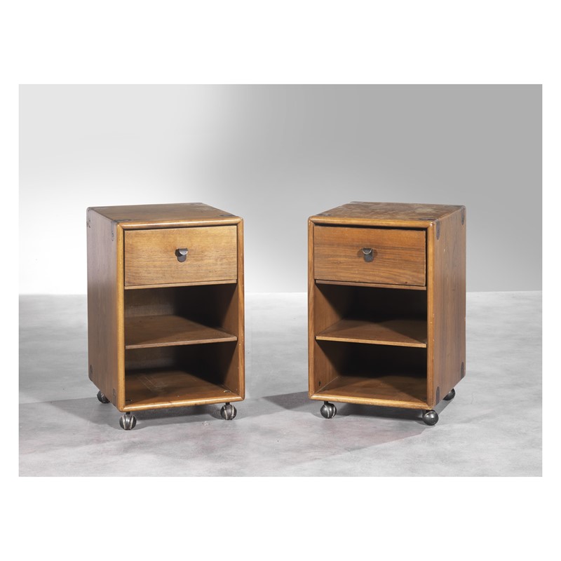 Fabio Lenci (Roma, 1935) COPPIA DI COMODINI in teak massello, maniglie e dettagli in ottone, cassetto frontale, uno dei due su ruote in ferro Produzione Bernini, Italia, 1976 cm H37xL43xP60 e cm H37xL43xP54