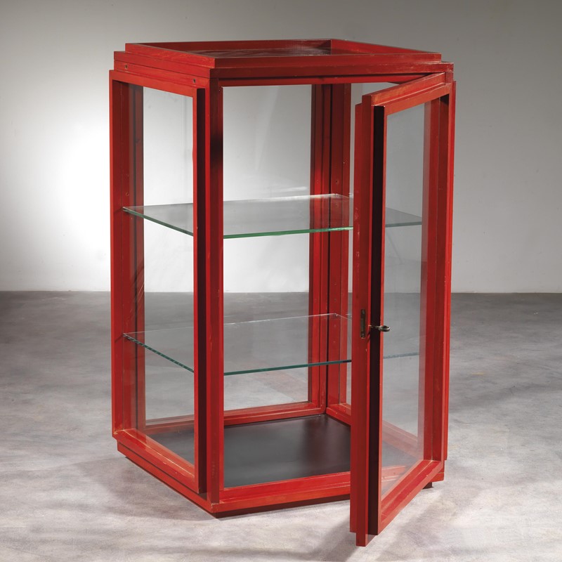 DISPLAY CABINET, RED LACQUERED WOOD AND GLASS