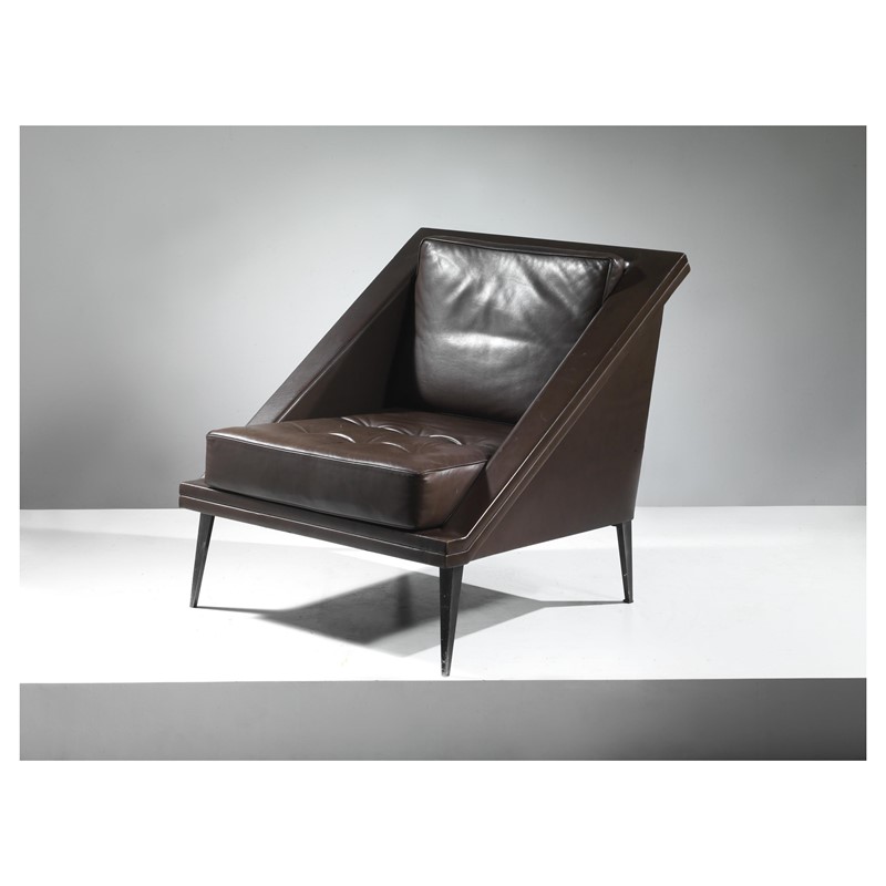 ARMCHAIR, WOODEN AND METAL STRUCTURE, BROWN LEATHER UPHOLSTERY