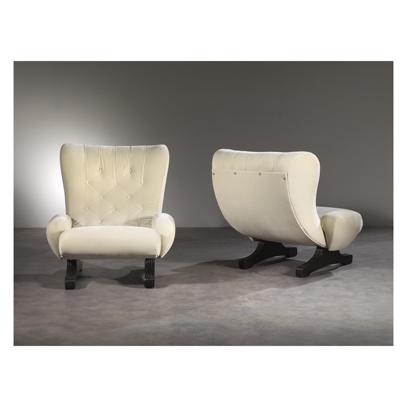 A PAIR OF ARMCHAIRS, WOODEN STRUCTURE, WHITE FABRIC UPHOLSTERY