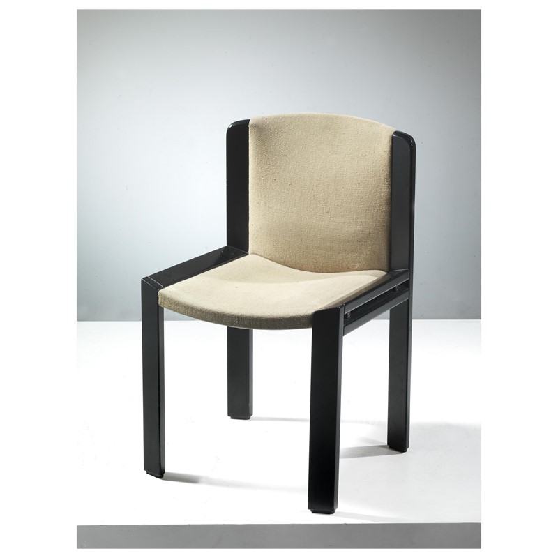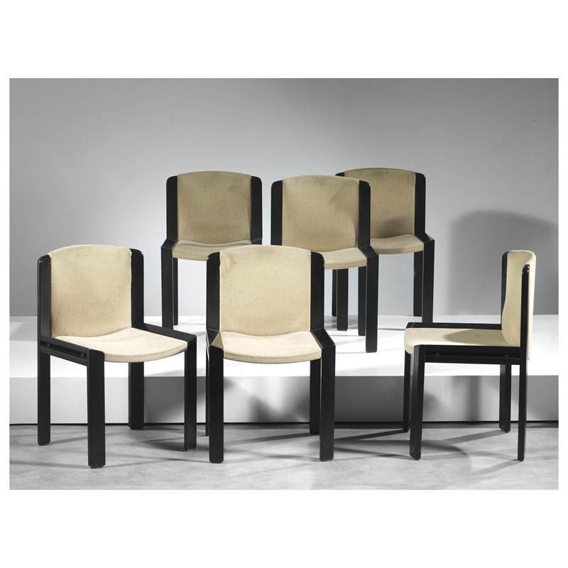 SIX «300» CHAIRS, BLACK LACQUARED WOOD, BEIGE FABRIC UPHOLSTERY