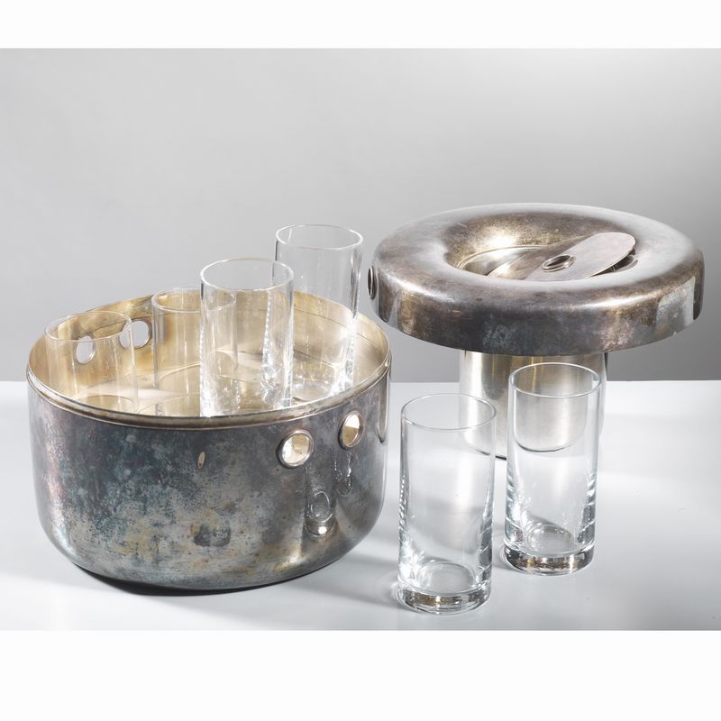 A SILVER PLATED BOTTLE AND GLASS HOLDER
