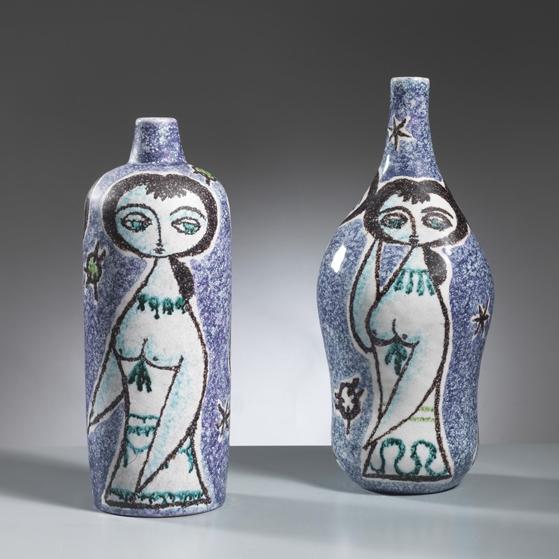 in ceramica policroma nei toni del bianco, viola e marrone, raffiguranti figure femminili