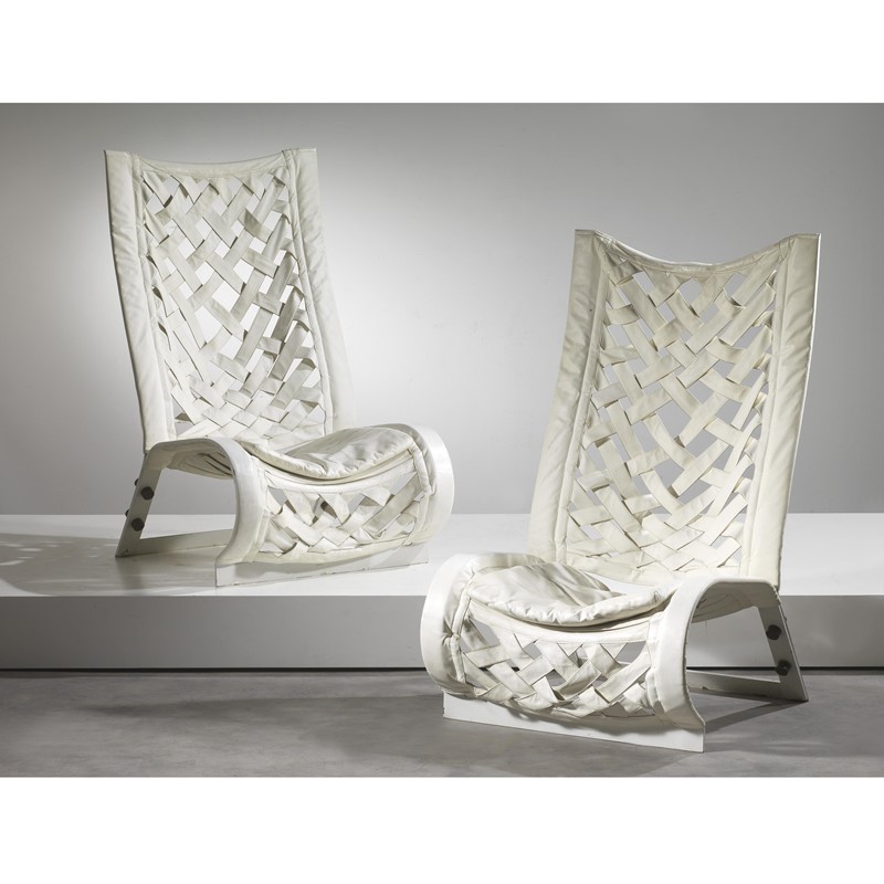 Marzio Cecchi (Firenze, 1940 - New York, 1990) COPPIA DI POLTRONE struttura in ferro e ottone, seduta e schienale in pelle bianca Produzione Italia, 1965 circa cm H122xL72xP85