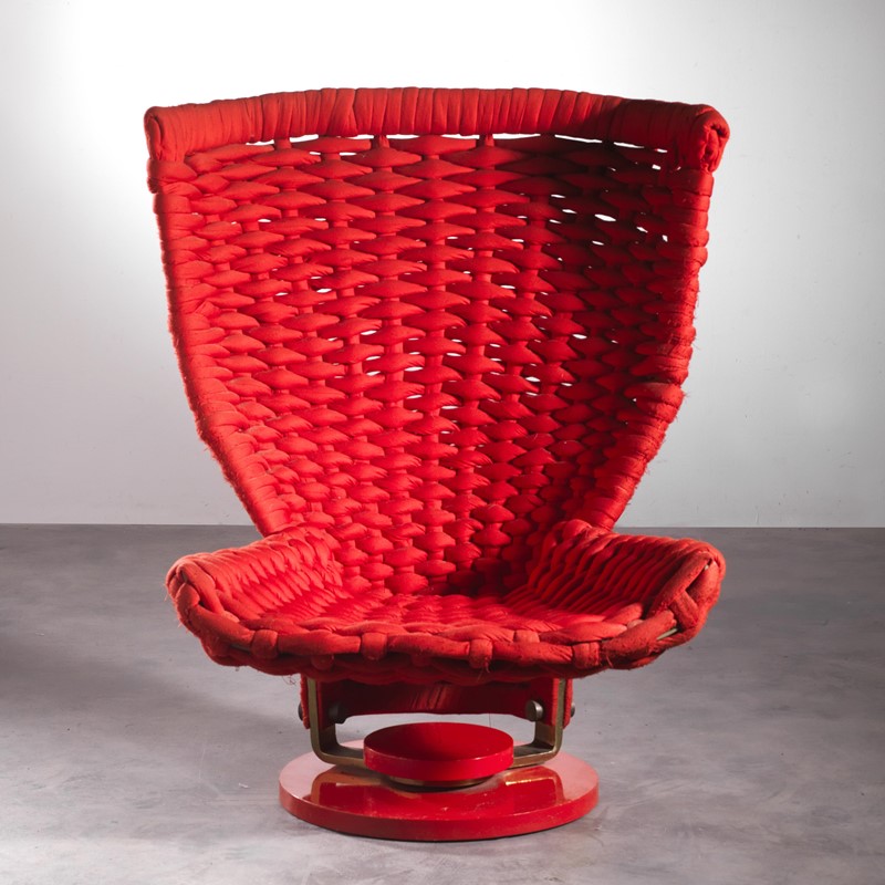 Marzio Cecchi (Firenze, 1940 - New York, 1990) POLTRONA GIREVOLE struttura in metallo, seduta in tessuto intrecciato e cuscino nei toni del rosso Produzione Italia, 1965 cm H108xL96xP85