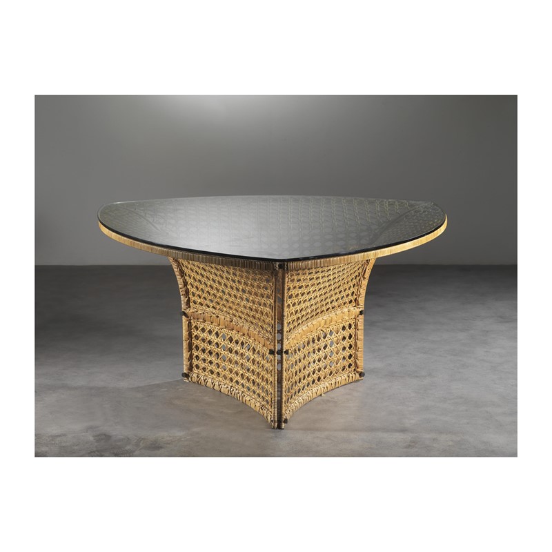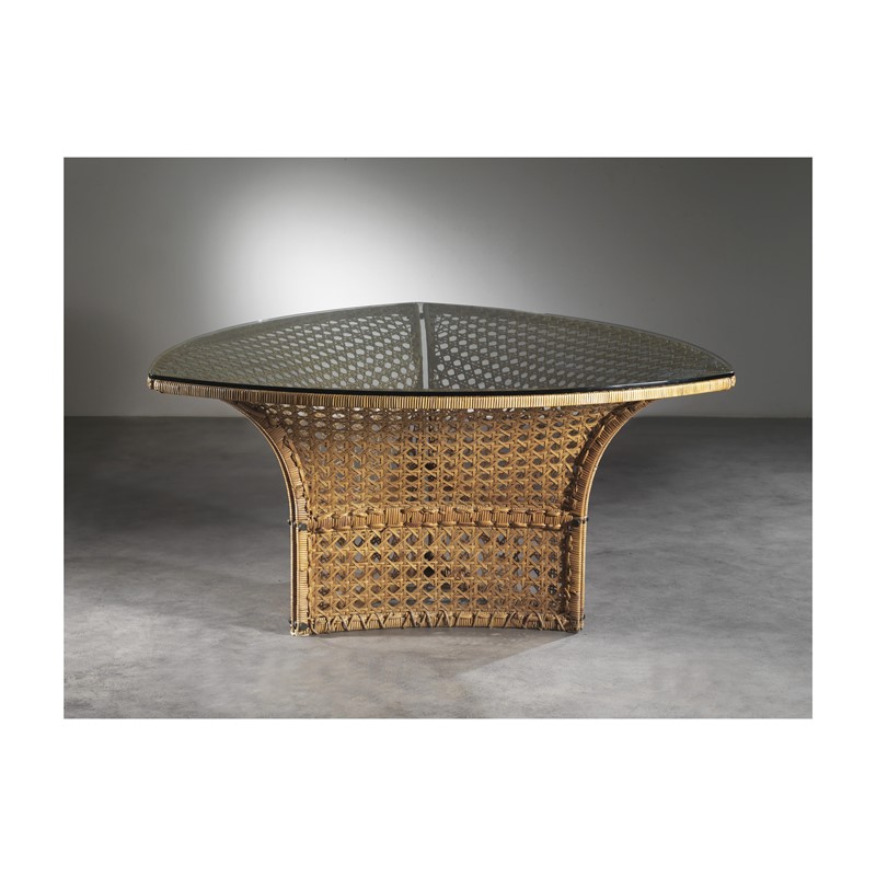 TABLE, VIENNA STRAW, BRASS AND GLASS