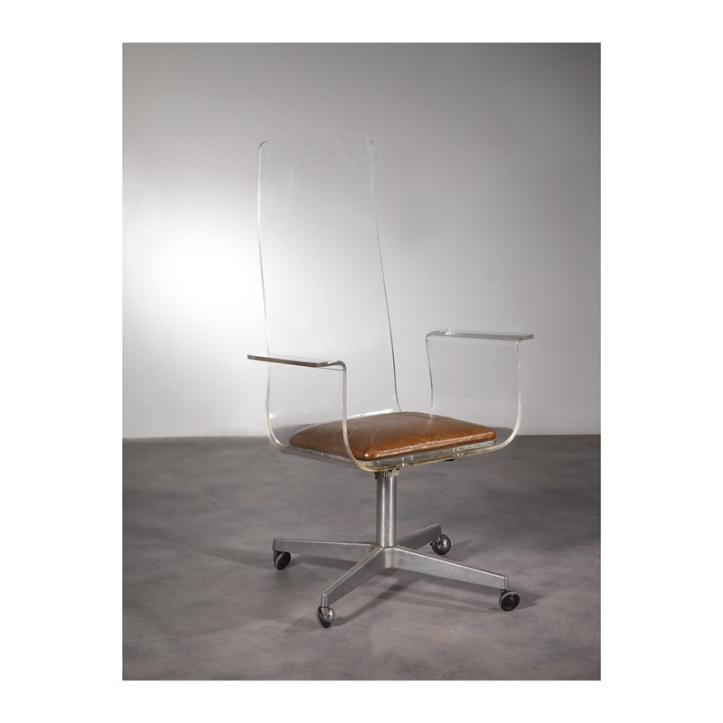 Marzio Cecchi (Firenze, 1940 - New York, 1990) POLTRONA GIREVOLE DA UFFICIO in materiale plastico trasparente, seduta imbottita e rivestita in pelle marrone, struttura in metallo Produzione Italia, 1965 circa cm H112xL66xP50
