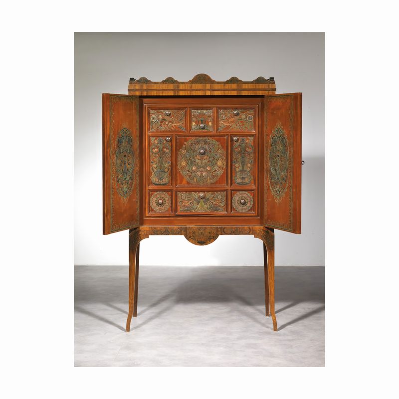 in legno impiallacciato e intagliato con decori a fiori e volatili