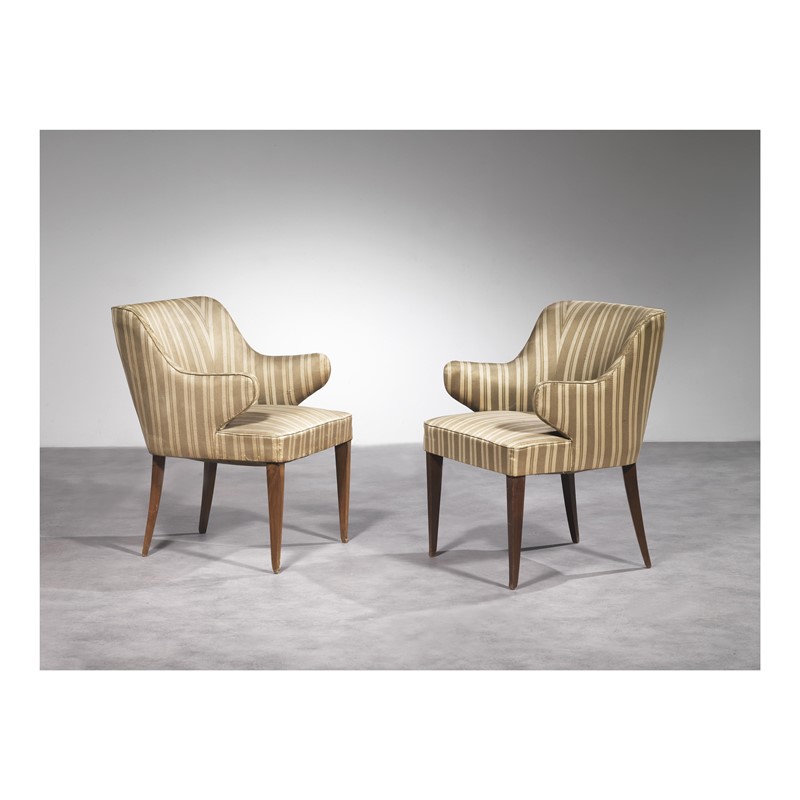 Paolo Buffa (Milano, 1903 - 1970) COPPIA DI POLTRONCINE struttura in legno, imbottite e rivestiti in stoffa a righe nei toni del grigio e avorio Produzione Italia, 1940 circa cm H80xL56xP58 Certificato di autenticità rilasciato dall’archivio Paolo Buffa