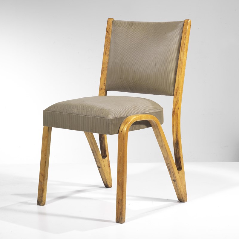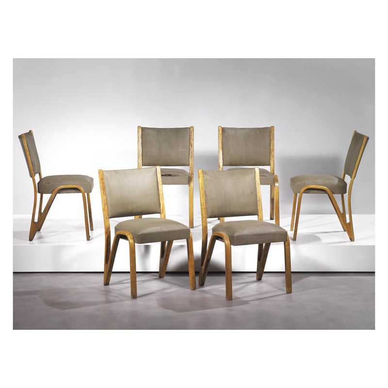 Paul Bode (Kassel, 1903 - 1978) SEI SEDIE in legno, seduta e schienale imbottiti e rivestiti in vinile a righe nei toni del grigio Produzione Germania, 1955 circa cm H81,5xL49xP65