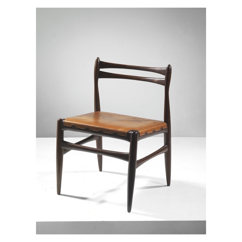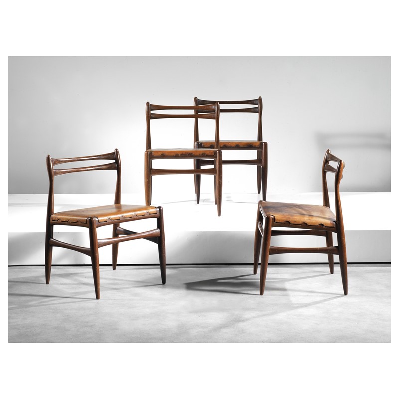 FOUR CHAIRS, WOODEN STRUCTURE, BROWN LEATHER UPHOLSTERY SEAT