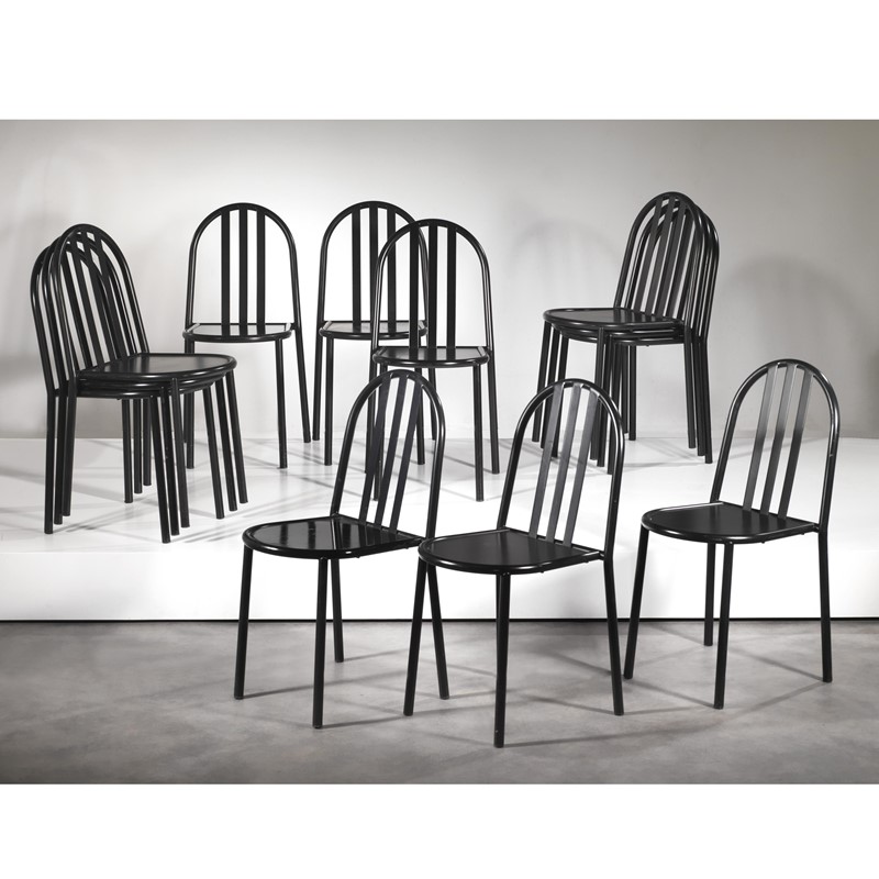 EIGHT STACKABLE CHAIRS, BLACK METAL STRUCTURE