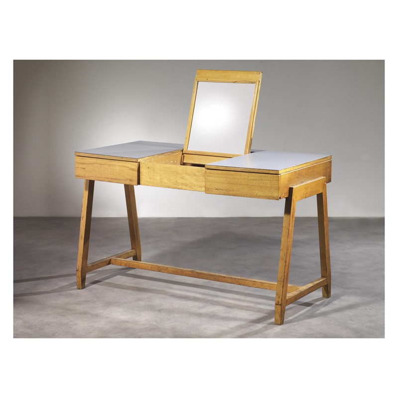 WOODEN DESK, MIRROR FLAP AND TWO DRAWERS, GRAY LAMINATED TOP