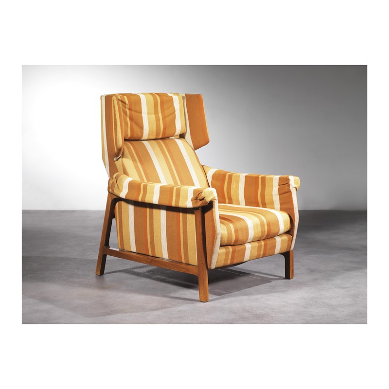 Umberto Colombo e (Seregno, 1960) Eugenia Alberti Reggio (XX) POLTRONA struttura in legno, imbottita e rivestita in stoffa a righe nei toni dell’ocra e dell’arancio Produzione Italia, 1957 cm H92,5xL68xP78