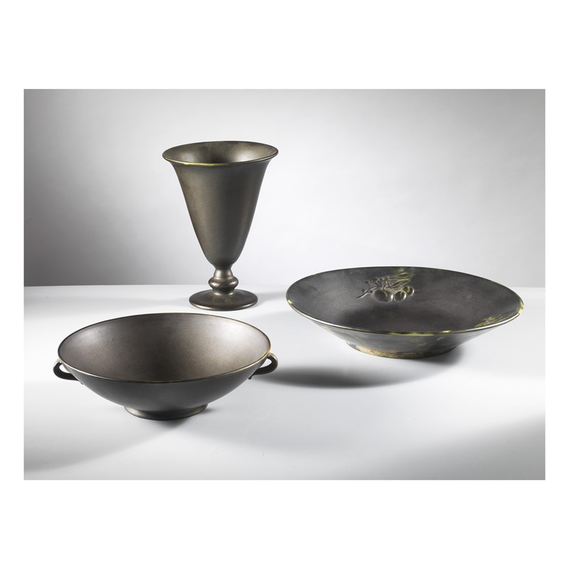 A VASE AND TWO CENTERPIECES, BLACK ENAMELED CERAMIC