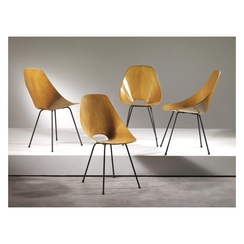 FOUR «MEDEA» CHAIRS, CURVED PLYWOOD STRUCTURE, METAL LEGS