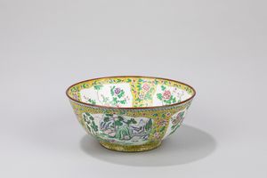 cm 19,2 x 36 x 30,5 in smalto dipinto a foliage floreale, forma lobata a quadrifoglio, con cartouches in bronzo [..]