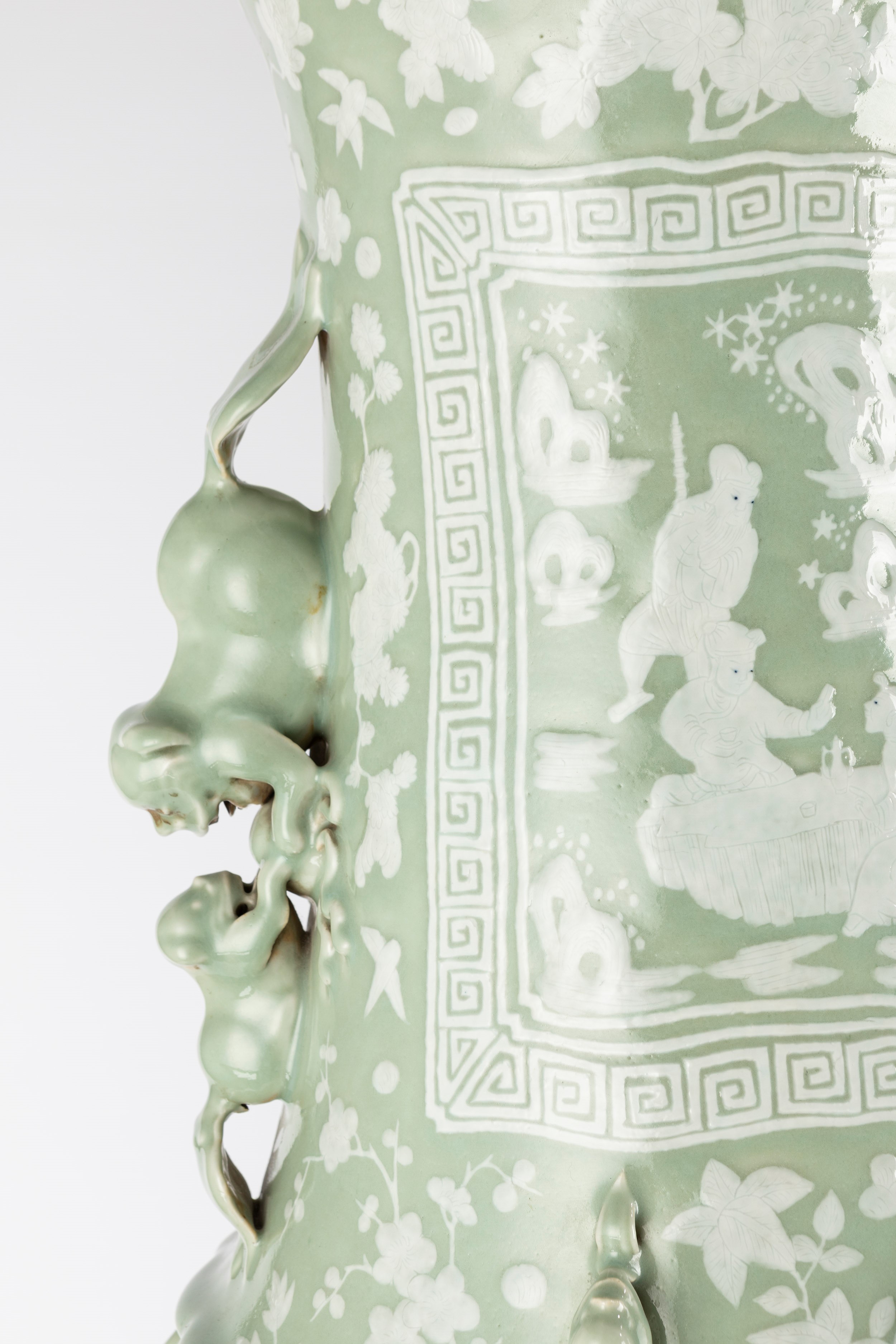 con decorazione a rilievo bianca raffigurante scene di battaglia entro riserve e con decorazioni floreali e con fenici, anse a guisa di animali fantastici e qilin in rilievo, poggianti su basi coeve in legno finemente intagliato