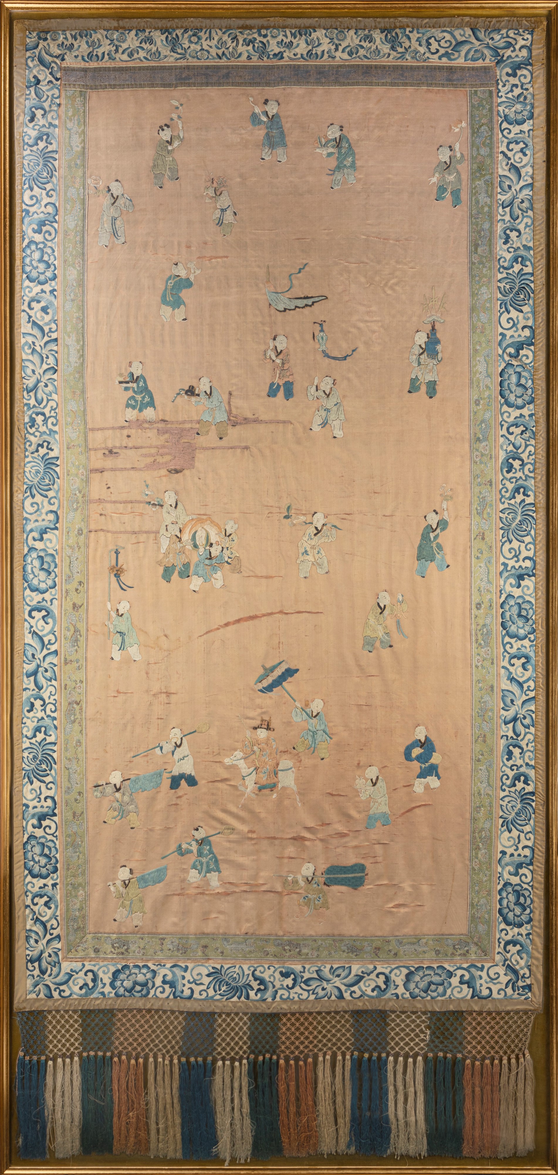 Grande pannello in seta ricamata a motivo di bambini. Cina, secolo XIX
